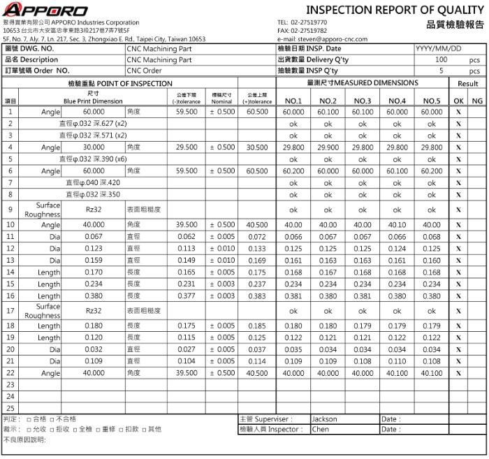 APPORO do believe that QUALITY is everything for a CNC machining service supplier. A Quality Control Processing is applied to keep improving our quality. According to part profile and dimensions, each CNC machining project is with variant quality control plan. Basically, we can provide below quality inspection reports: